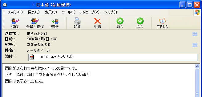 この中にある 『イメージのダウンロード』 項目の「HTML 電子メールにある画像および外部コンテンツをブロックする(B)」にチェックを入れて下さい。 届いたメールが下記のようになっていればOKです。