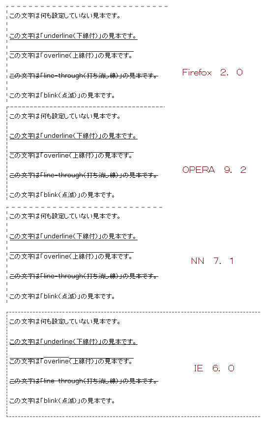 上記の文字をIE、NN、OPERA、Firefoxでそれぞれ見比べてみました。 (詳細はこちらから ご覧下さいませ[静止画像です。約9.82KB])。IE以外は皆キチンと「blink」指定した物は点滅しております。 (心なしかFirefoxで指定した物は他の物より早めに点滅している感じが致します)
