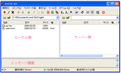 (ダウンロードをしてソフトも設定済みにも関わらずデスクトップ上にアイコンが無い方は、『マイコンピュータ > Cドライブ > Program Files > ffftp 』 にアクセスするとソフトがございます) - 下記のような画面が起動したかと思います